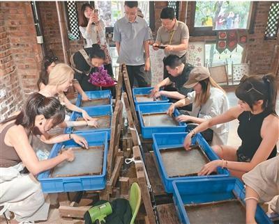 r在耿马傣族佤族自治县孟定镇南汀画院,台湾新媒体人亲手体验白棉纸制作。该技艺是被誉为“中国古代造纸术活化石”的国家级非遗。造纸工艺完整保留了“浸泡、蒸发、捣浆、浇纸、晒纸”5步流程和11道工序,造出的纸坚韧洁白、防腐防蛀,过去多作为寺庙抄写经文之用,现在则用于民间手工艺品加工和书法、茶叶包装等,传统产业历久弥新。